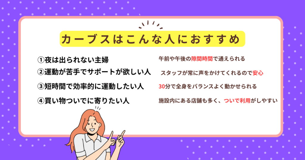 この記事では、カーブスの体験の流れや雰囲気、料金、メリット・デメリットに加えて、実際の口コミも合わせて紹介していきます。