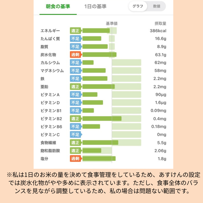 下記のグラフは、あすけんで調べた納豆卵かけご飯(ご飯150g)1食あたりの栄養バランスです。