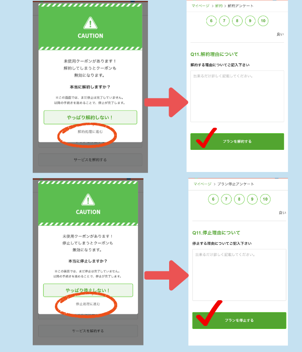 10門前後のアンケートに答えて「プランを解約する」・「プランを停止する」を押して完了