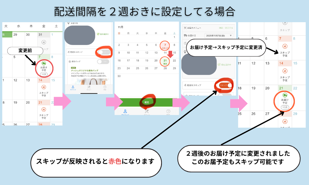 設定している配送間隔に合わせて、スキップ後のお届け予定日に「配送」と表示されます。配送間隔はいつでも変更OK。(マイページ → お届け設定から変更可能)
