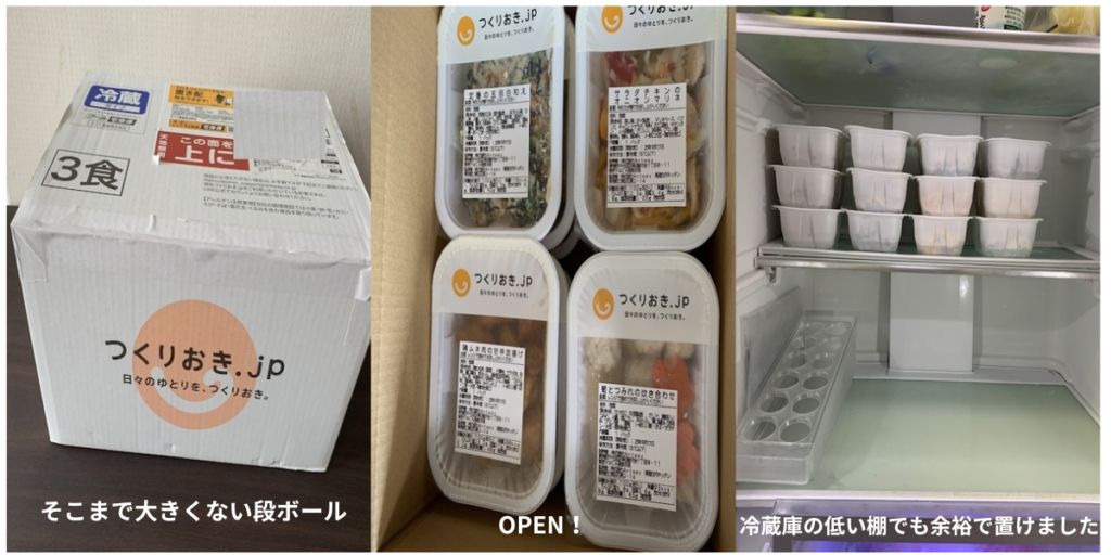 我が家(小中学生2人+大人2人)には、少し多いぐらいのボリューム。白米と汁物をつければ十分満足できる食事量でした。また期待以上の量に、台所を預かる主婦としては嬉しい悲鳴でした。届いたおかずを見て主菜・副菜の組み合わせを決め、冷蔵庫のありもので調整しつつ、食べないパックは冷凍して次回の献立に回せるのが便利でした。冷凍のお弁当タイプの宅食と比べて全体の量が多く感じられた点も、満足度が高い理由の一つです。